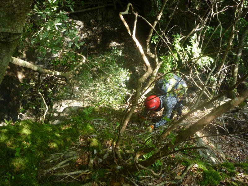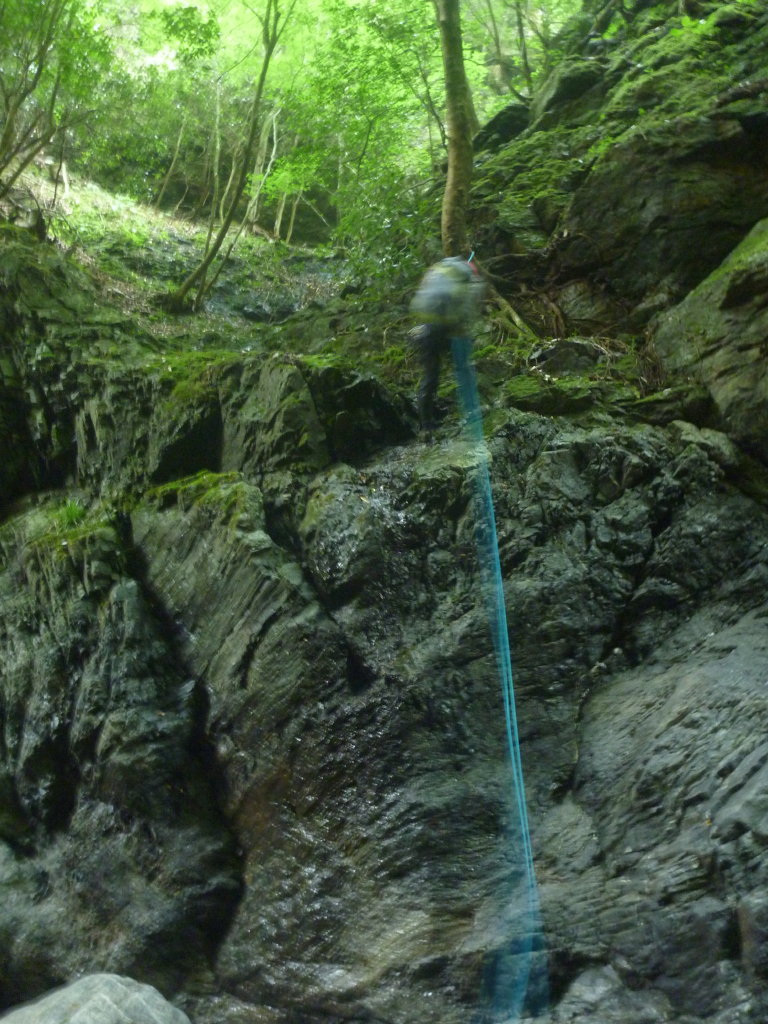 更に戻ったところからバック気味に、岩壁の弱点を立ち木を利用して樹林帯まで上がる。そこから踏み跡を辿って延々とトラバースを続ける。イガミ滝の姿をチラッと見ながら落ち口のラインを過ぎた。最後は懸垂下降で谷に復帰。久し振りに水に触れることができた。