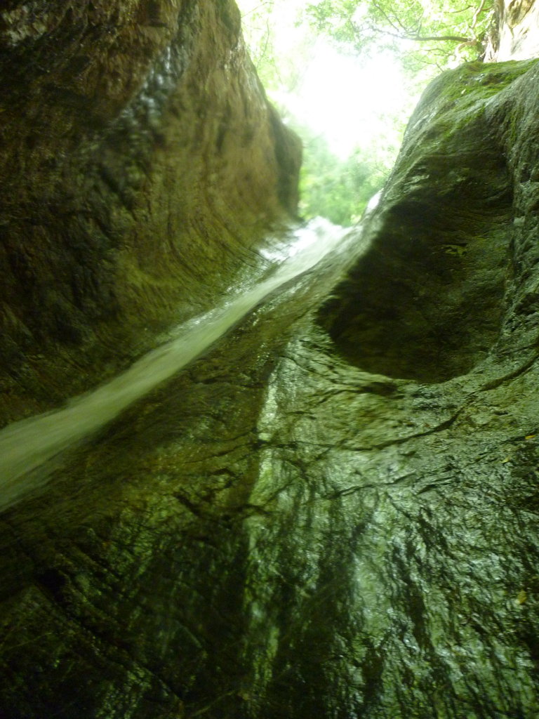 入口付近は荒れているものの、その奥はなんとか無事のようである。思わずホッと胸をなで下ろした。しかしこのゴルジュにあるはずの9m滝がない。あったのは2mばかりの落差がふたつだけである。ここも土石流の餌食になったのだろうか。