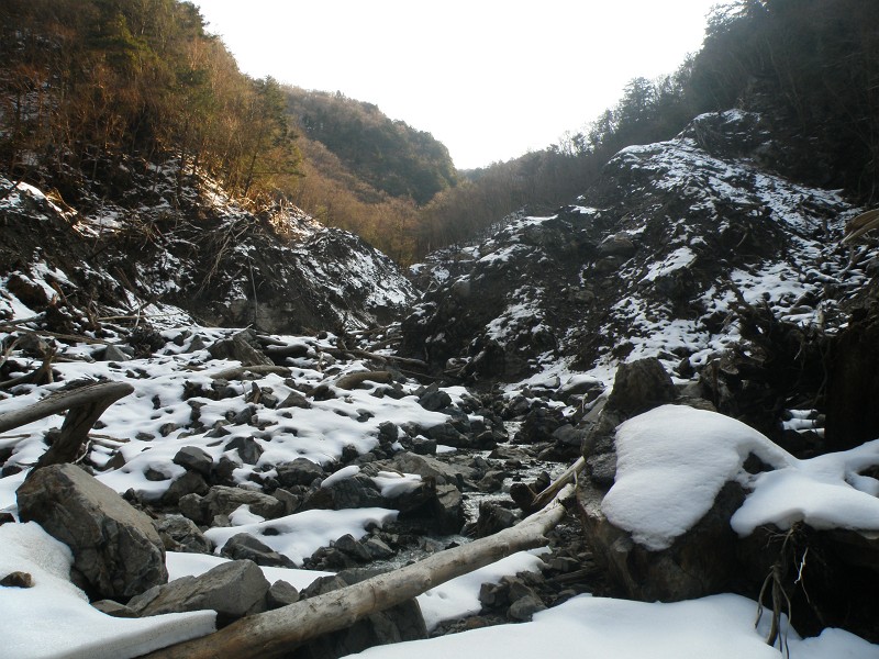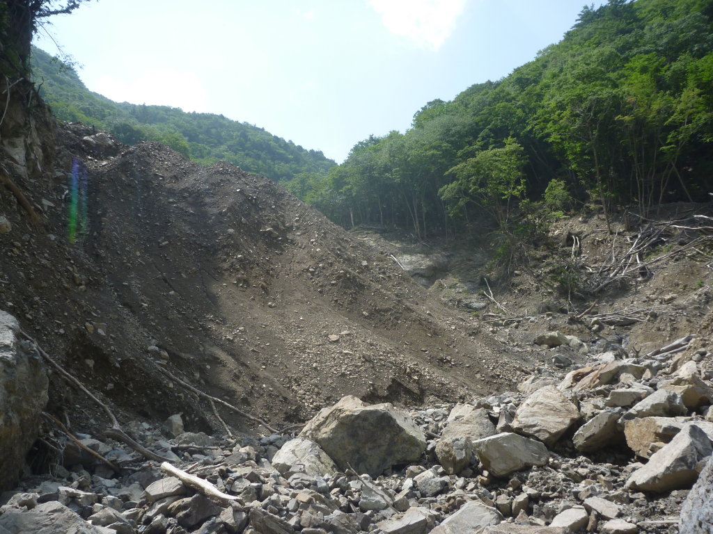 左岸から入る支流の入口を土の堰堤が塞いでいる。谷が左へカーブすると息を飲むような光景が目に飛び込んだ。右岸側に30mぐらいはありそうな土の山が出来ている。これは元々あったものが水流に洗われたものなのか、押し出されて堆積したものなのか。写真を拝見すると、すこしは落ち着いたかな(^^;と。しかし、落ち着いた清流に戻るには、何年もかかるだろうね~。