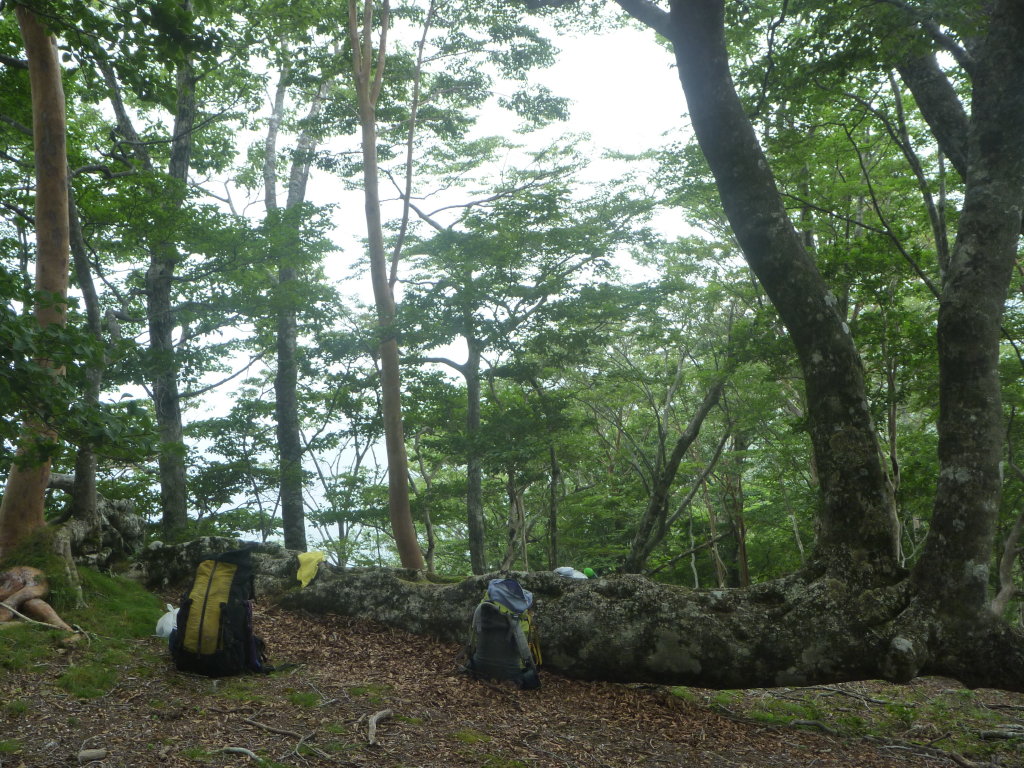 ブナが大勢を占め始めると山頂は近い。やや西寄りの登山道に出たが、まあ及第点ということにしておこう。野江股のシンボルの寝そべったブナが見えれば待望の野江股ノ頭に到着だ。いつもの如くハイタッチと握手。私とふ~さんの沢登りにおいて、やっぱり沢と山頂は不可分のものである。何度も訪れている見慣れた山頂だが、何度来てもいいところだ。驚いたことに携帯のアンテナが全開だ。どこかの電波を拾っているのだろうか。