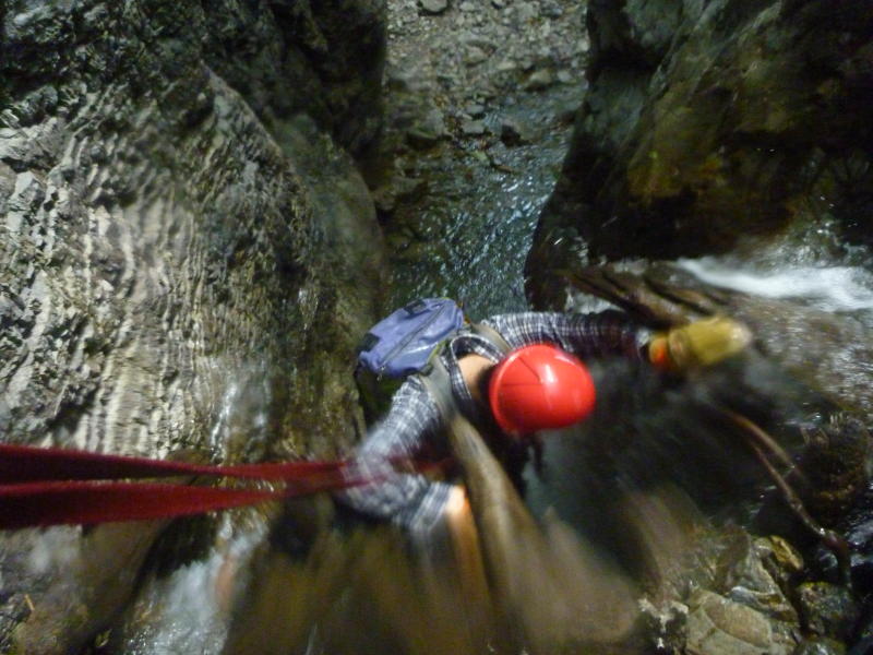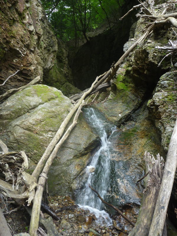 谷は癒しの様相を見せ始めた。末広がりの5m、V字の5m(コマネチ滝と名付けた)と快適に直登。右からテーブルのような岩が被さる斜瀑は手前の流木を利用して取り付き、スパイダーマンのように張り付いて抜けようとするも、上部では手掛かりなく、巻き上がってきたふ~さんのスリングに助けられた。次の大岩の奥にかかる8mでは落ち口に挟まった流木が邪魔でスリングを出す。