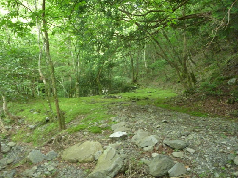 ジグザクに付けられた歩きやすい道は実に楽で下山向きである。噴き出す汗を拭いながら1時間半ほどで林道終点に帰着した。谷を渡る手前のしっとりとした幕営適地は水害の影響も受けず健在だったのがうれしい。