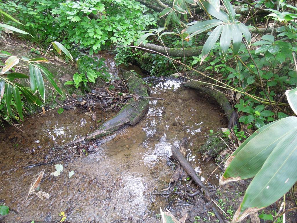 がんばろう。すこし道がはっきりしたところを行くとなんと水が流れている。尾根通しのはずなのに何故?地図を良く見ると少し
