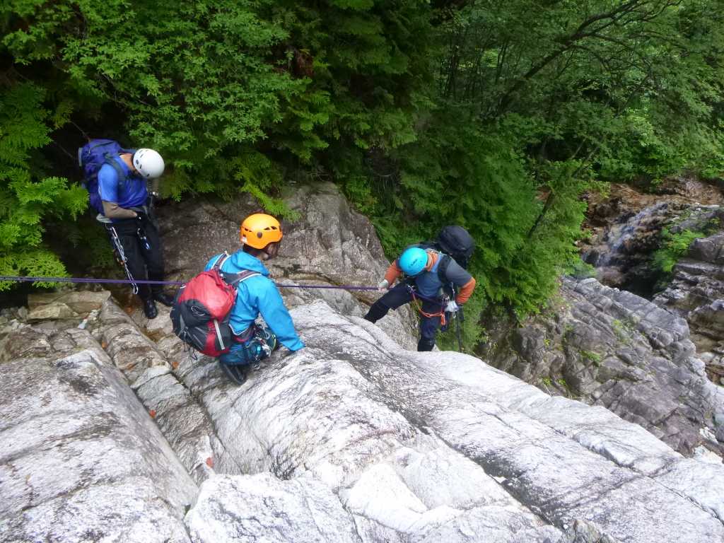 すぐに淵を持った15m斜滝だ。ここは流れの右側をフリーで登れないことはないが,壁がたっているので安全を見越してロープをだすことにする。私のトレーニングのために,トップで行かせてもらう。クラックがあるように見えたのでカムを使ってみたかったのだが,意外にクラックが小さくカムが効かない。しようが無いので2カ所にハーケンを打って支点を作る。ちなみにこれが私の本番での初ハーケンだ。手頃な立ち木があったのでそれを支点にして後続を確保する。