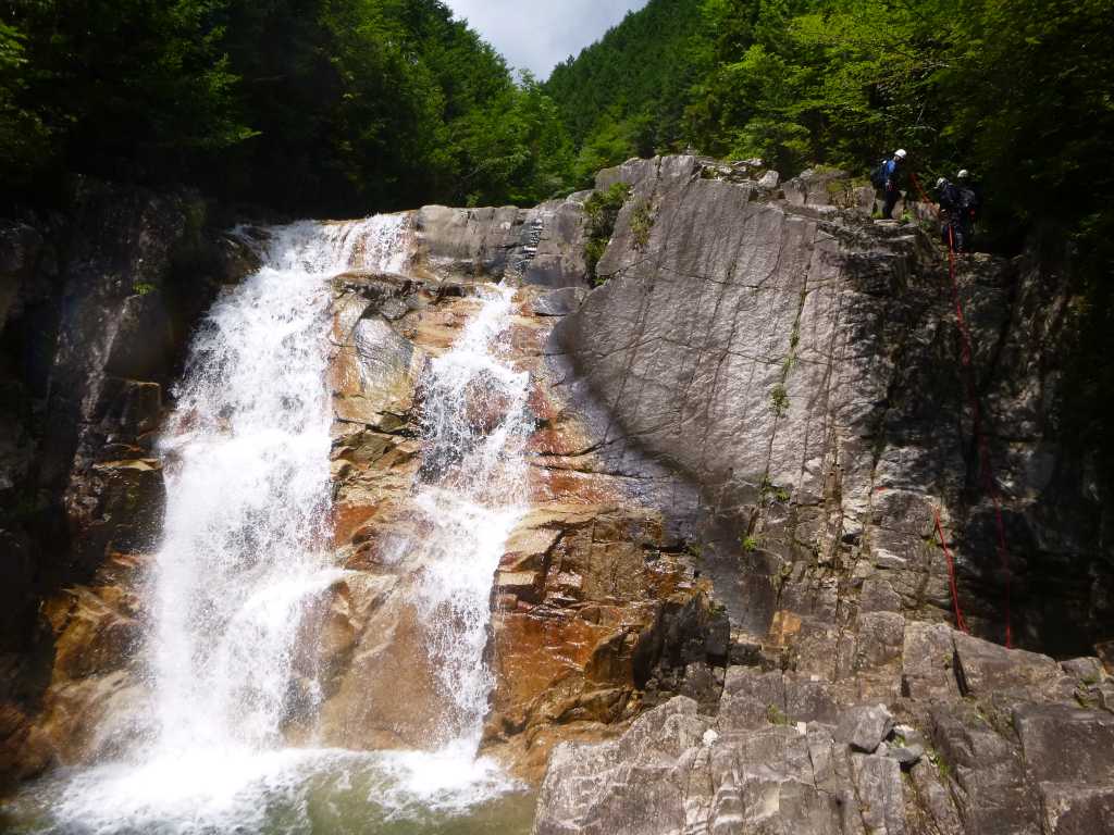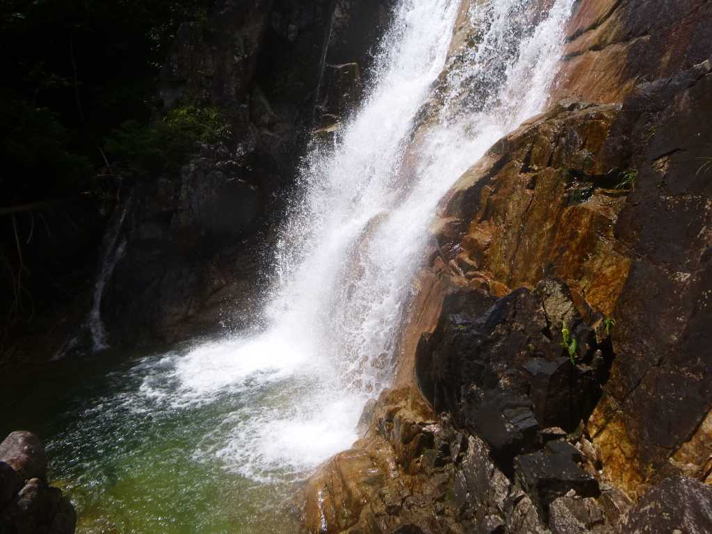 昼食を終わってしばらく行くと大きな淵を持った滝に出る。たろーさんが泳いで突破し,滝を直登する。なおちゃんも続く。M木さんと私は右岸側を巻く。すぐに三俣の15m滝に出ると3人グループが懸垂で降りてこようとしている。後でたろーさんに聞くと大垣山岳会のメンバーで兎夢さんの知り合いらしいとのこと。この滝は壁がたっていて高度感はあるが,足がかりがしっかりしているのでフリーで簡単に登ることができる。