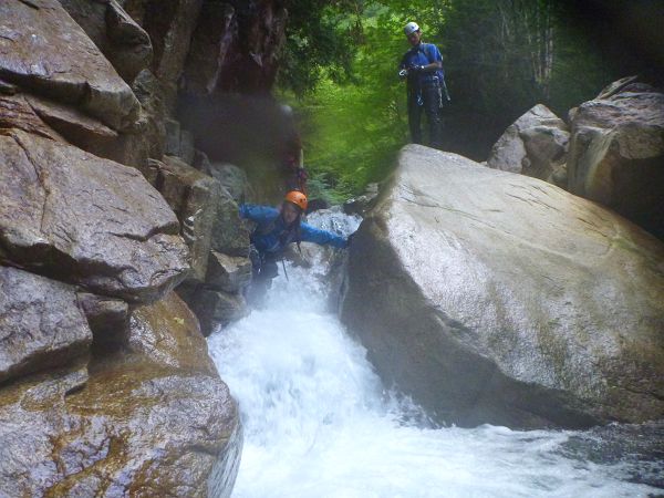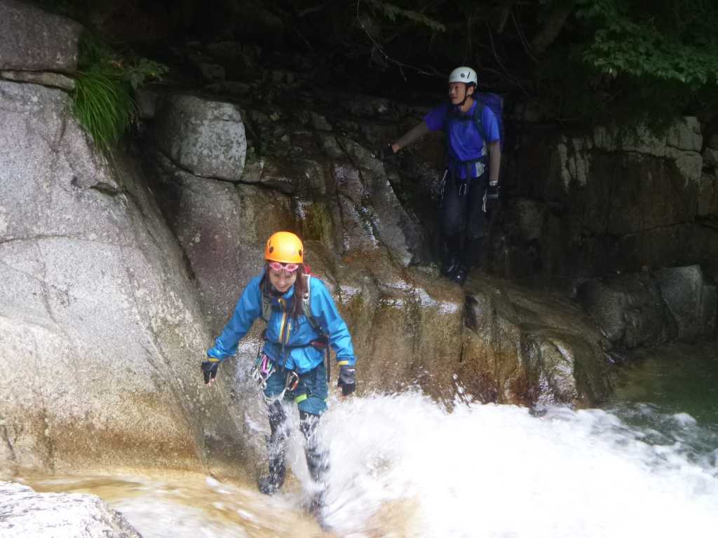 続く7m滝の左岸側を登ると気持ちのよいナメが現れる。なおちゃんが流れを横切るのをいやがっている。どうも流れに足を掬われるのが怖いようだ。ふ〜ん,飛び込み,泳ぎ何でも怖いものなしのなおちゃんでも怖いものがあるんだねえ。なんとか横切る。「体重の差だねえ(^^)」と私。「でもシュークリームさんとそんなに体重違わないでしょ」となおちゃん。私は細そうに見えるが,身体が締まっているだけで実は60キロ以上はあるのだ。それを聞いてなおちゃんも納得した様子。