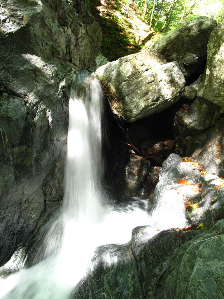 ゴーロの岩間滝をいくつか越え枝分かれした古木がある平地をすぎると3条5m滝が待っている。陽に照らされた三筋の滝が苔生した岩壁を落ちていて美しい。右の流れを越えると左岸の高台に炭焼き窯跡が残されている。窯の前後には水平道の痕跡のような感じは残っているが、今は落ちていて辿るのは難しそうだ。大釜を持つ4m滝は左岸を小さく巻くとワサビ谷の出合に着く。