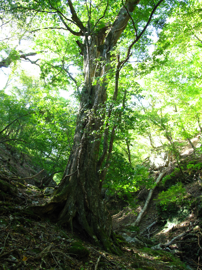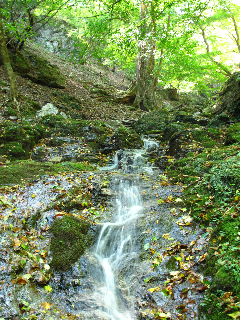 自然林の明るい谷は高度を上げていく。すると水流の先に大きなトチノキが鎮座している。不思議なことにトチノキの場所で水流は消えており水の主と言ったところだろうか。