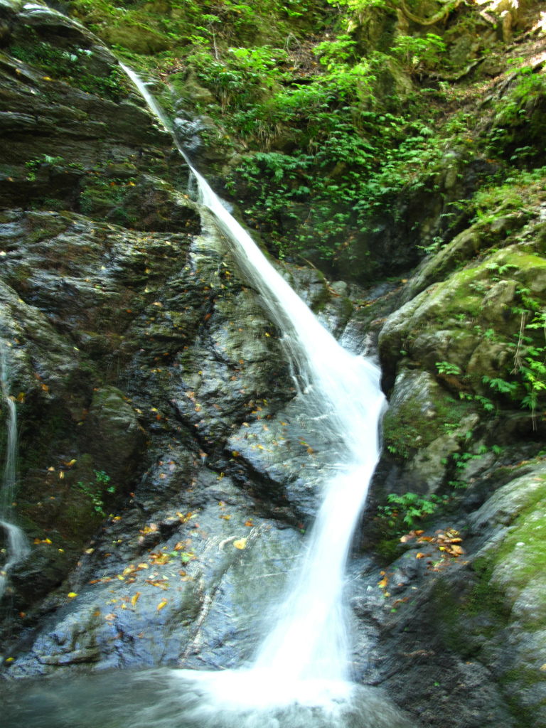 廊下に入って最初の滝を越えると釣り人が糸をたらしており、無言で会釈して先を行く。このあたりは岩が水流にみがかれて印象的だった。5m滝は右岸を巻くと、岩壁から流れ落ちる12mの直瀑で行き詰る。右岸のルンゼにロープがあるが、下から見ると「あんな所登るのか」といったずるずる斜面のいやらしそうな巻きだ。登っていくと人が通っているだけあって見た目より簡単に巻けた。滝口からは釜に漂う落ち葉がきれいに見えた。