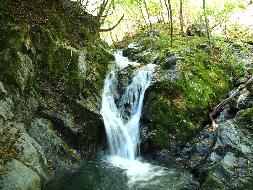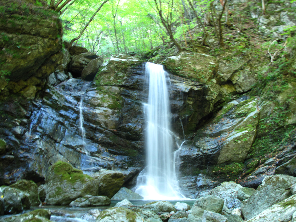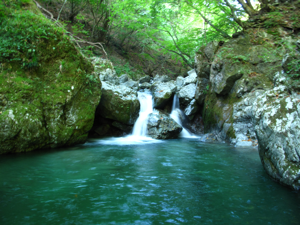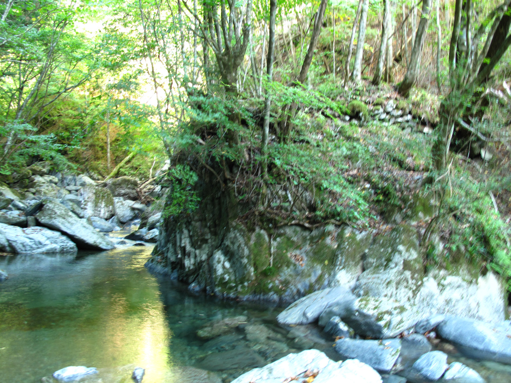 本流の右俣を進むと谷には自然林の斜面から木漏れ日が差し込み心地よい。エメラルドグリーンの淵をめでながら2m滝、6m斜瀑と快適に越えていくと鉄砲谷の出合で、ここで釣り人とわかれる。