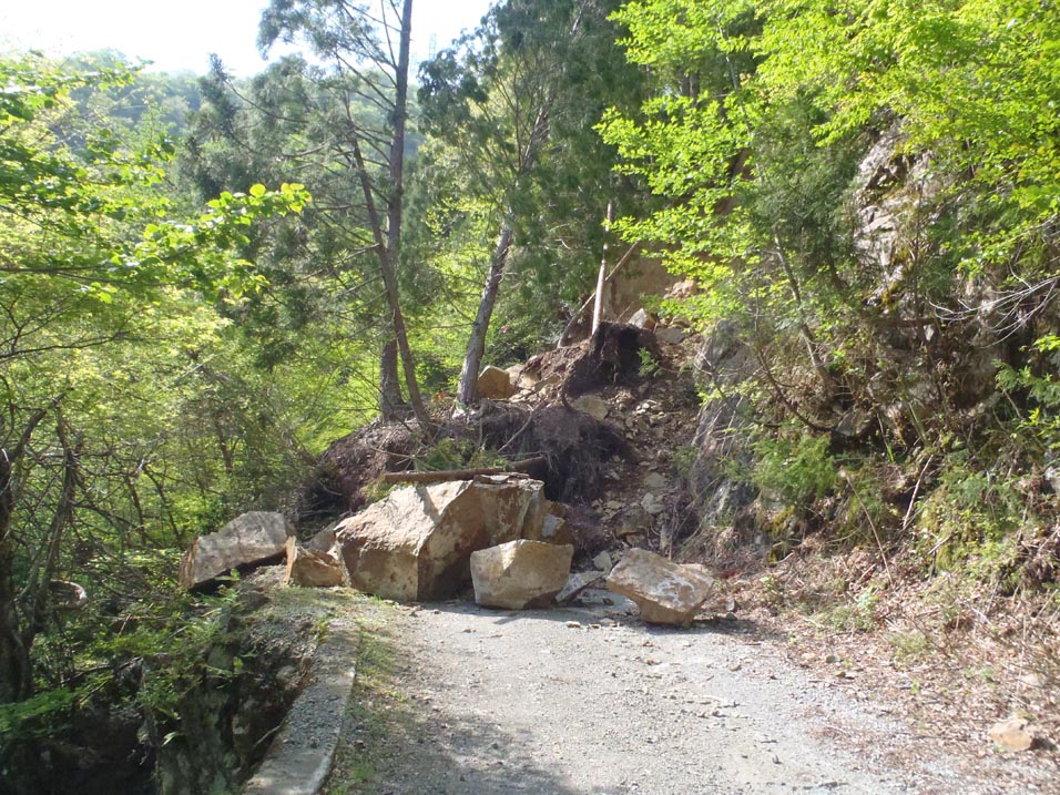 慌てて脇に寄ってくれたのでさらに進む。林道は水浸しの所が多く落石も散乱している。林道は清水谷の先100mほどで崩落土砂で覆われていた。茨川まではさほどの距離でないようだ。 林道を引き返すと、鹿だと思うが白骨化した死骸が2体転がっている。往路では気づかなかった。