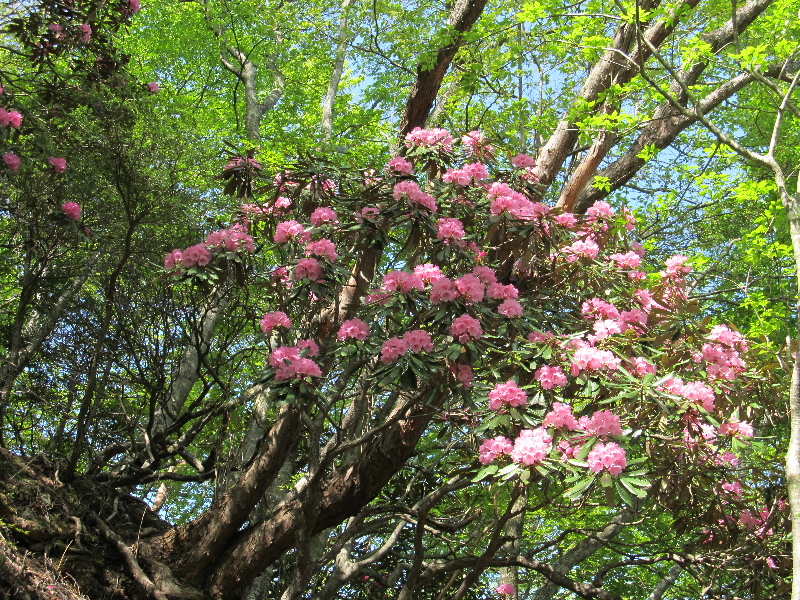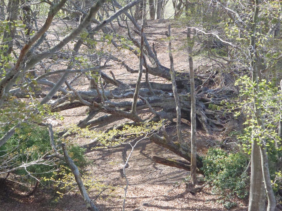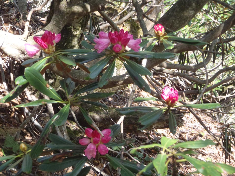 大峠の頭~舟窪間の鞍部の登山路で一株のシャクナゲがあり、満開とはいかないが華やいだ雰囲気が嬉しい・・・・・が、腹の虫に催促され昨夜から何も食べていない事を思い出す。 舟窪の倒木を眼下に眺めなら深谷山に到着すると、周囲はモーレツなシャクナゲ地獄だ、赤い点がまばらにあり開花はさらに後の事のようである。それにしても蕾の数は半端じゃない、一週間後には多分シャクナゲ天国になっている事だろう。 腹ごしらえの後、来た道を戻る。