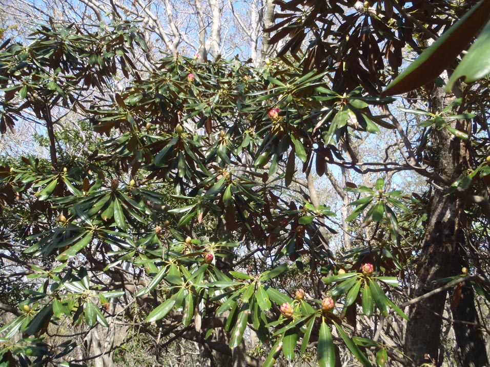 舟窪の倒木を眼下に眺めなら深谷山に到着すると、周囲はモーレツなシャクナゲ地獄だ、赤い点がまばらにあり開花はさらに後の事のようである。それにしても蕾の数は半端じゃない、一週間後には多分シャクナゲ天国になっている事だろう。