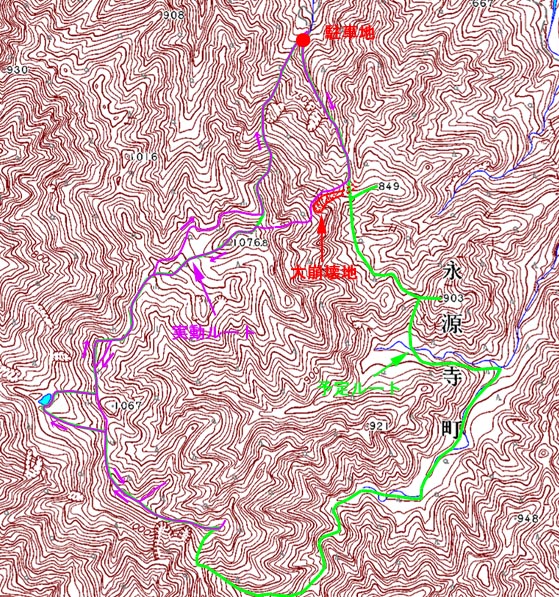 - 2日目、5:00銚子ヶ口(モノレール口)~7:00銚子ヶ口東峰~8:30深谷山~9:30水舟の池~11:30駐車地