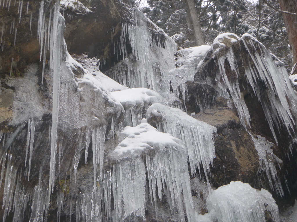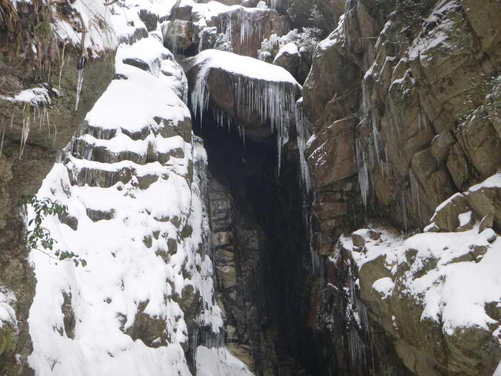 駐車場の雪は2,3センチ程度.思ったよりも少ない.御在所山の家を過ぎて本谷に入ると,左岸ルート方面にトレースがあった.前回の経験で右岸ルートの方が歩きやすい事がわかっているので,トレースのない右岸ルートへ進む.すぐに左岸を歩く男性グループの声が後ろになり,右岸ルートの方がずっと早い事がわかる.しばらく歩くと不動滝だ.左岸ルートを歩くグループはまだ到着していない.