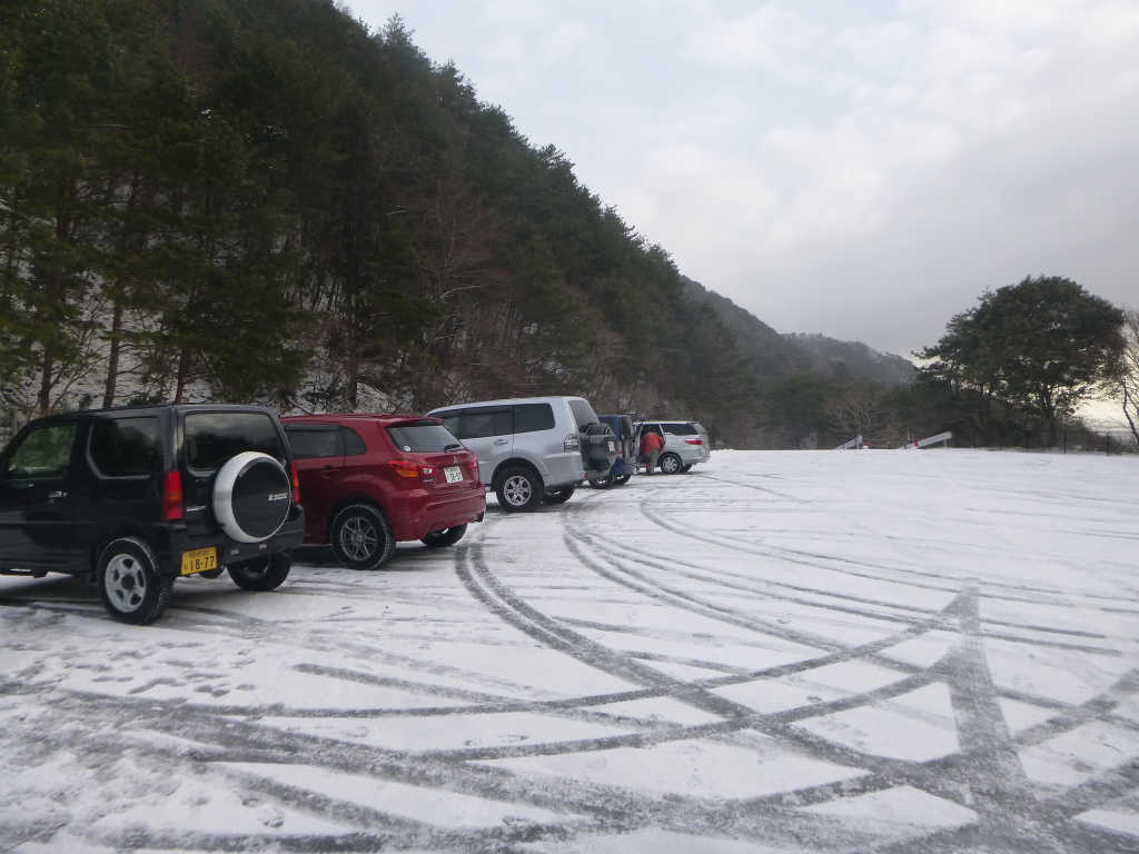 湯ノ山温泉を越えて車道を登っていくと1台の車がスタックして動けなくなっている.幸いすぐ後ろにいた車の人たちが押し上げてくれたが,今度は斜面に停めた私の車がスリップして動けない.仕方ないので,少し下って改めて登り直した.