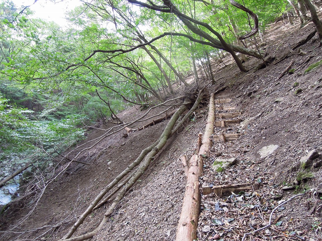 右岸の登山道を行くが思いのほかしっかりとしたルートである。斜面の道も木を渡して歩きやすくなっている。アレーかなり手が入っている。復旧に向けてどなたかが手入れされているらしい。ふ~む。