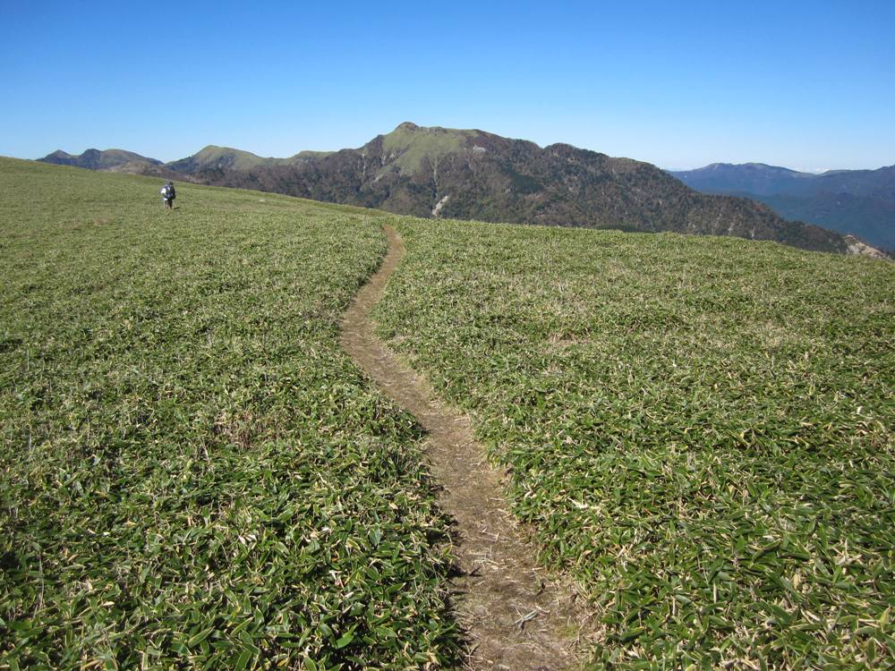 みるとミヤマクマザサにおおわれた尾根に延々と踏みわけ道が続いているのも視認できます。至福の時を
