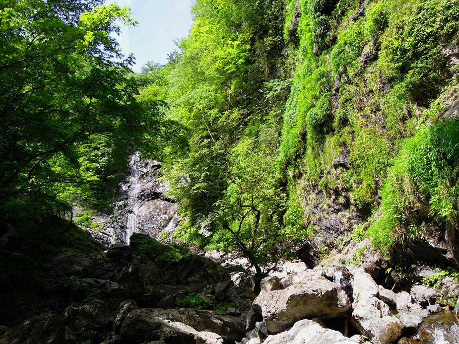 新緑に包まれたサスケ滝。