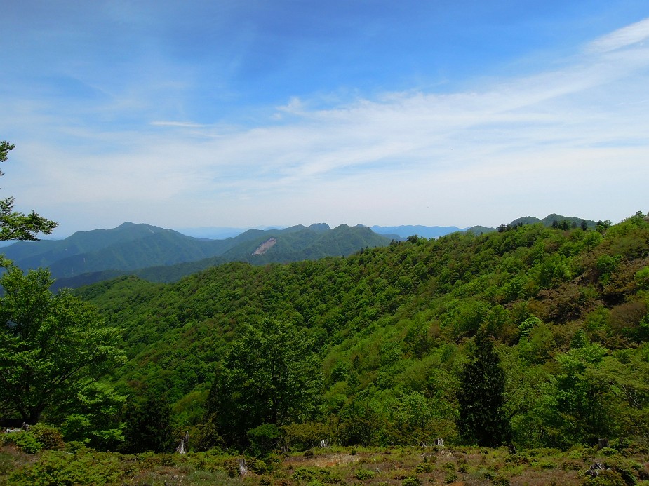 気持ちの良い空の下、新緑の山々の展望。その何処かに白い樹影があっても良さそうなものだが、一切見受けられない。これほどまでシロヤシオの花が咲かない年は過去あったろうか?