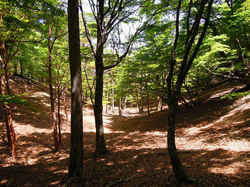 この急登は辛い。足を運んでもズルズルと滑るので、いつもの労力より二割増しだ。ただ、展開したばかり木々の新緑の中をゼェゼェとは云え呼吸するのは気持ちが良い。