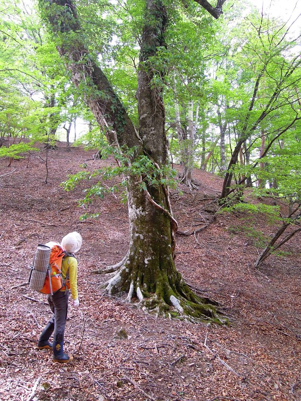 奥ノ平1,220mのダイラ。太いブナが倒れながらも新葉を展開している。昨年樹下でヒルネしたシロヤシオにも花はない。