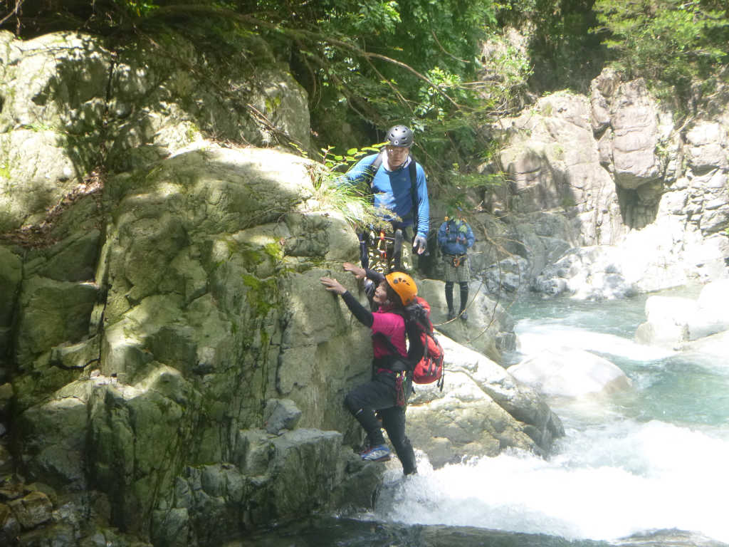 次の8m滝も左側の岩を登る.ここは1ヶ所だけ,1mほどの垂壁を突破すれば簡単なので,残置スリングと私が出すお助けスリングを使って登ってもらう.