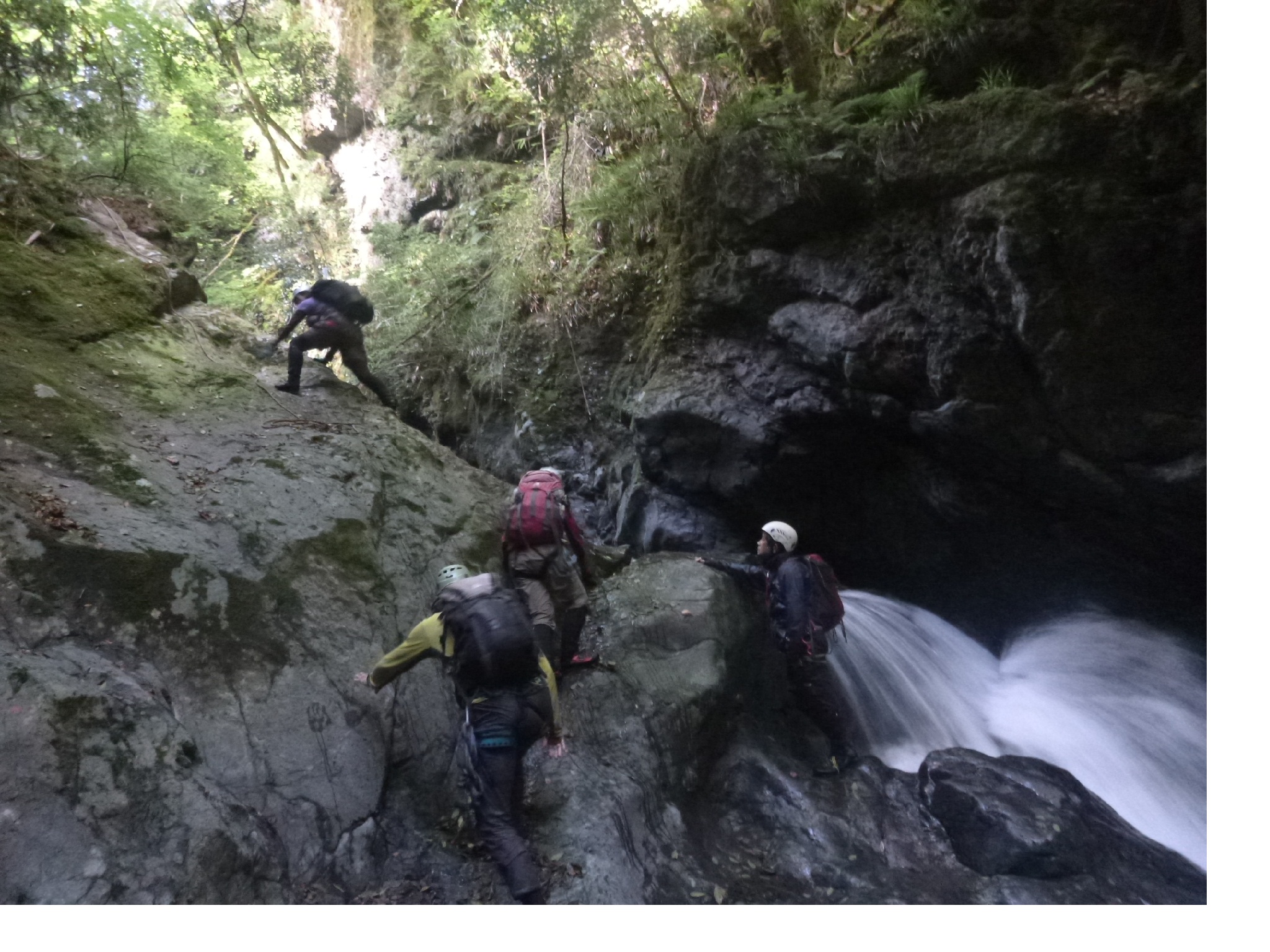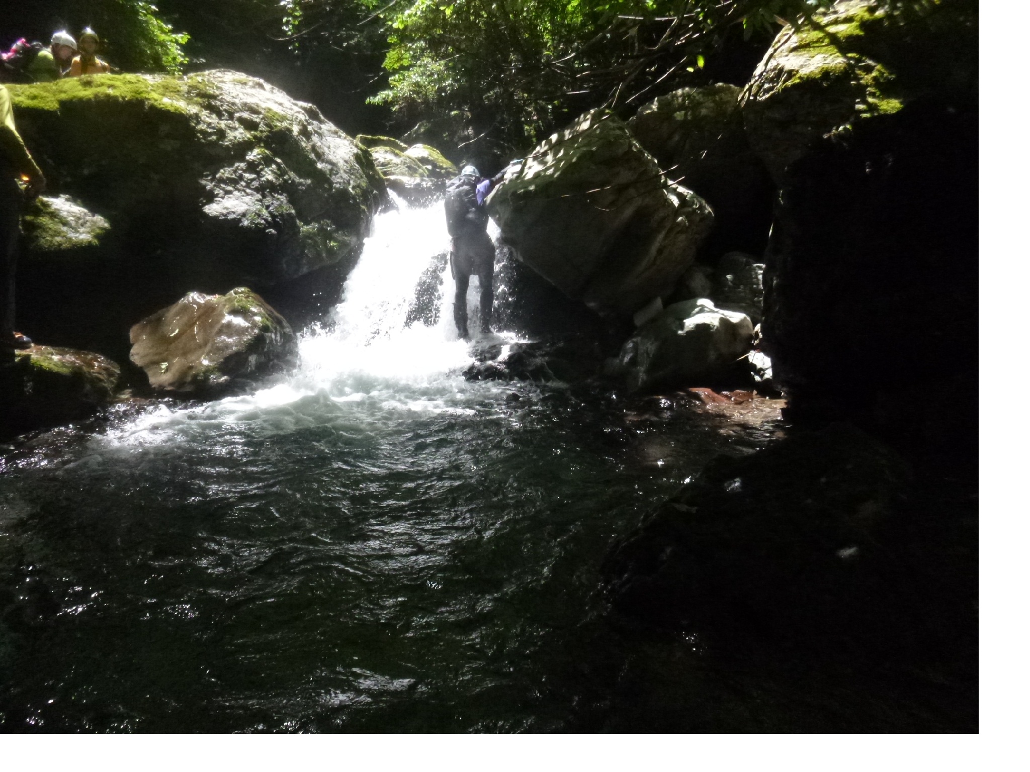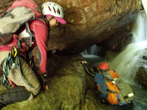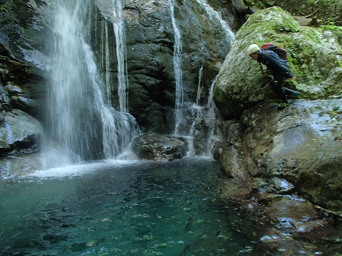 トンネルになった左の岩棚の上を歩けるが、滝の落ちている所は小さな釜があり腰までの深さがある。