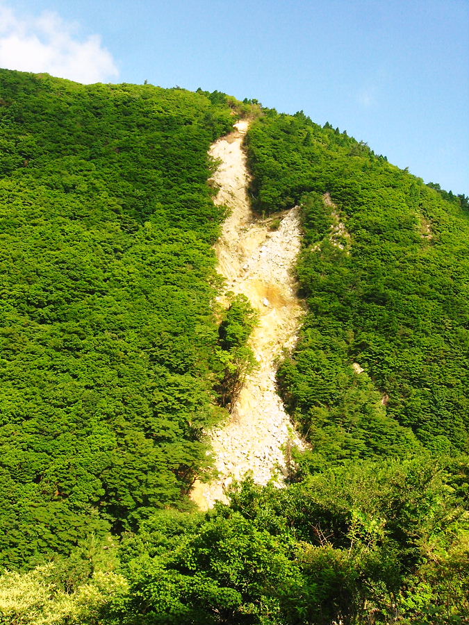 対岸の崩落は山頂まで達してるよ、崩落跡はいい岩壁を見せてる。だれか登りいな。
