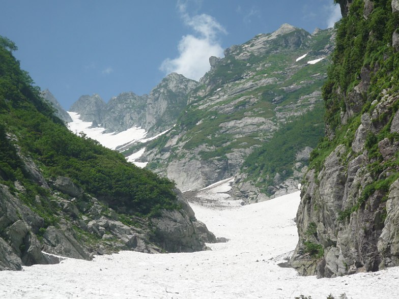出合から傾斜30度くらいまでの雪渓をひたすら登って1時間30分ほどで標高2600m付近にある大きな横長の「熊の岩」に着く。ここで遅めの朝食とした。ここで谷は右俣、左俣に分かれる。左股は熊の岩のところで雪が溶けて細くなっており、今年は雪が多いので通れるようだが、普通はいったん右俣に入り熊の岩の上側を巻いて左俣に入り直す。急がば回れで右俣経由としてみた。