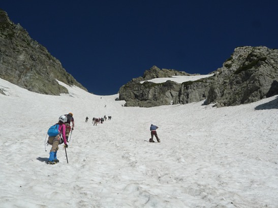 でお弁当をもらってコーヒーを頂いてから結局5時30分に出発した。10分くらい歩いてから小さな滝で雪渓が切れているところを巻いて、アイゼンを装着し長い雪渓歩きが始まる。谷に入るとき剣沢から下ってきたペアがいて、ほぼ一緒に登り勝手に写真のモデルになってもらった。しかし何という好天だろうか。雲ひとつない真っ青な空に岩と雪が映えて、脳天がくらくらする。山に登る人でこの情景に感動しない人がいるだろうか。