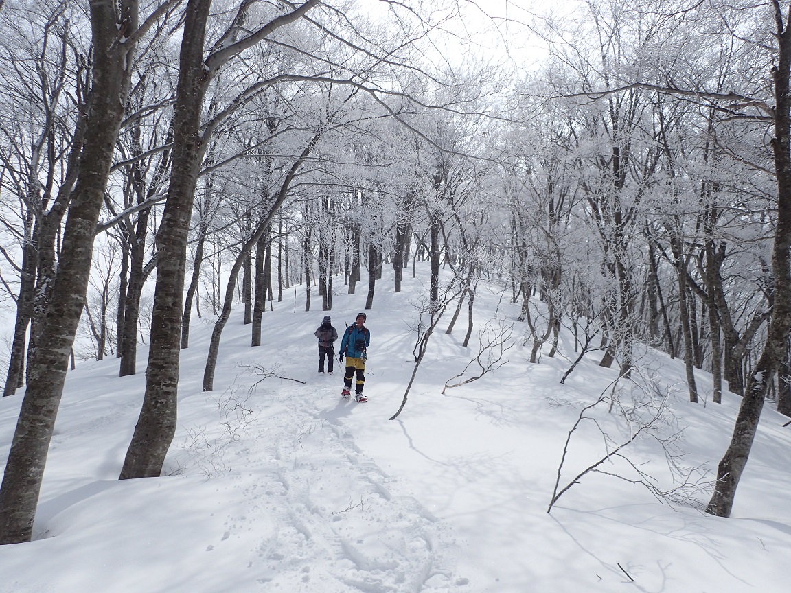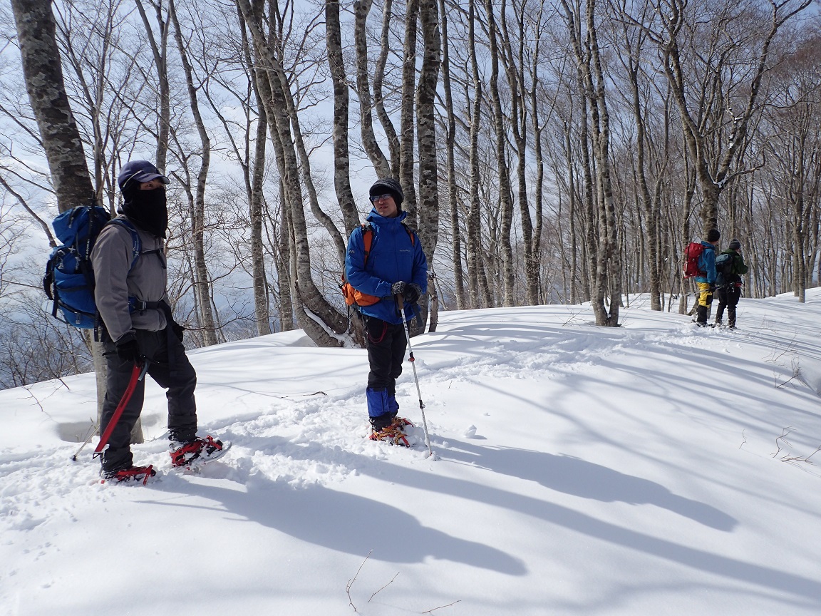 下山は西峰まで戻って北西尾根へ。この尾根、広くてブナ林が綺麗で、西尾根よりずっと歩きやすい。しかも頂上付近は締まった雪の上に少し新雪が乗っていて、サラサラ感がありながらもスノーシューの爪がよく効く。気持ちよく歩けるが、先行するKasayaさんとわりばしさんは滅茶苦茶速い。若い2人は12本爪のアイゼンの上からワカンをつけた万全の下山装備だが、2人の早さには遅れがちである。すると、かとう君が片方のワカンを外している。どうしたのかと思ったら、ワカンのベルトが、アイゼンの爪で切れてしまったらしい。最強のアイゼンワカンも、さすがに12本爪では無理があったか。