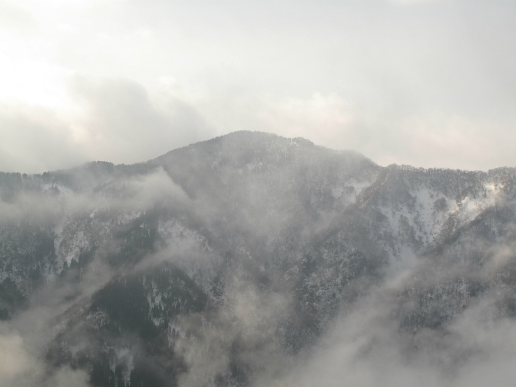 川を渡り、趣のある集落を過ぎるとすぐにスノーシュー装着。若い2人はワカンである。使い慣れておらず、装着に結構時間がかかった。そして西尾根の取り付きに。夏道の登山口の表示がある。しかし、どこが登山道なのか分からず、相当の急斜面。藪もある。途中で横断する林道まではやみくもに登った。ワカンは滑って大変だろうが、若い2人も蟹股で爪を効かせて踏ん張りつつ、遅れずについてくる。林道手前あたりから、わりばしさんのトレースと合流した。林道を過ぎると、徐々に歩きやすくなってきた。 天気は曇りだが、青空が垣間見えてきた。期待できそうだ。それにしてもKasayaさんを先頭に歩かせると速くて往生する。特にワカンの2人は、文句は言わないものの閉口していたと想像する。ただ、途中でKasayaさんのスノーシューがずれてきて、「付け直すのでお先にどうぞ」と言われて私が先行したら、「速すぎる」と言われて、苦笑いした。 雪は新たに降った様子はなく、サラサラ感がない。降ったとしても雨かみぞれだろう。しかし、締まっているので、歩くのは楽である。ずっと先に、わりばしさんの姿がちらちら見え始め、971m地点の手前でわりばしさんが止まって待っていてくれた。