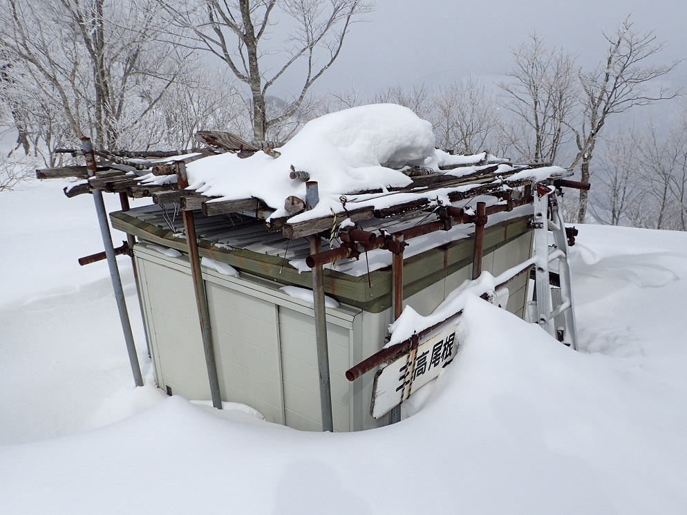 西峰に着くと、晴れてはいないが東の方に視界が開けた。頂上へは樹氷の中を歩く。頂上にはヨド物置が置いてあるが、半分以上雪に埋もれていた