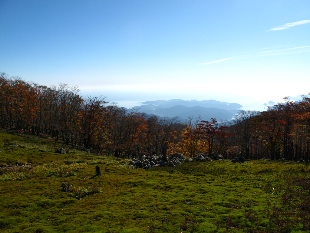 テントたたんだら寝てた跡が落ち葉に浮かんでた。おもしろい。荷物デポして地池高を出発。