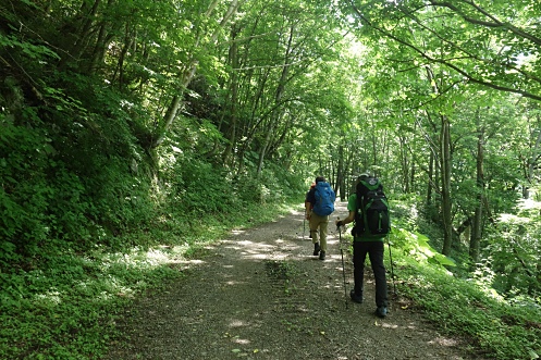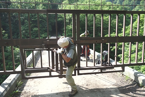 イドンナップ山荘は、荒れ放題で泊まる気になれない感じ。先客は10台以上。ここで群馬から来られた単独のMさんと同行することになり4人グループになった。ゲートをくぐって、いざ林道18.5kmに挑戦だ。2泊分の食料の他に、各自ビール(350mL)×2本、六右衛門は4合瓶1本も持っているので、荷物が重い。林道は木陰も多いが、天気が良すぎて暑い。よたよた歩いて約3km、いこい橋の橋上にあるゲートを潜る。