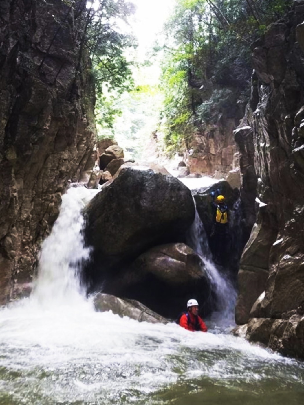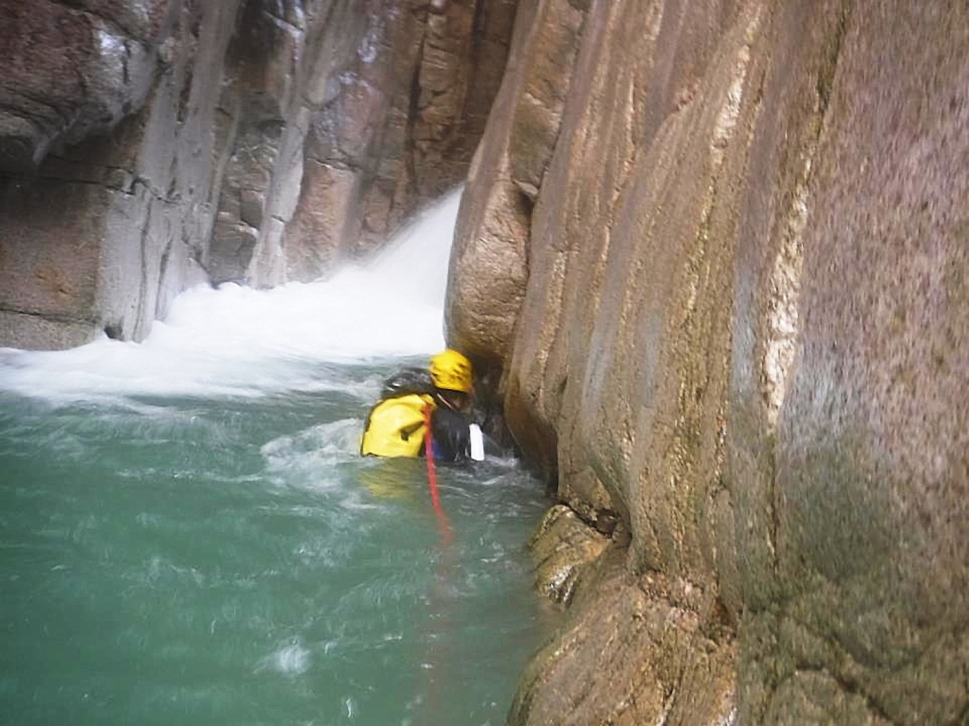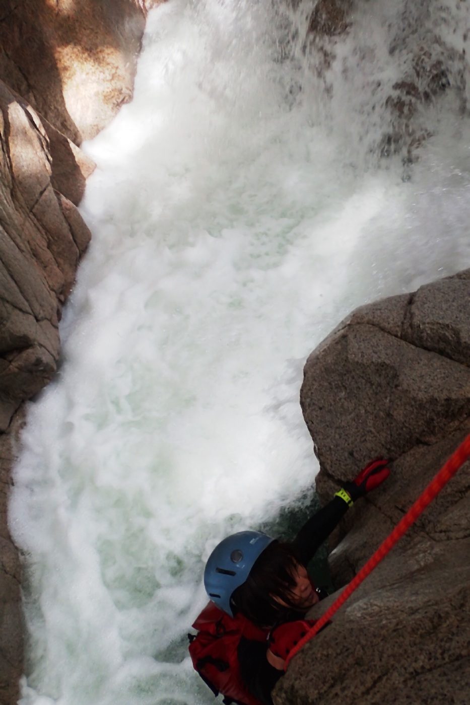 淵の中間部で岩にへばり付いてる2人を頭上からビレーする。斜め上からなので溺れる心配は無い。(正面から引っ張ると水没してしまう・・)