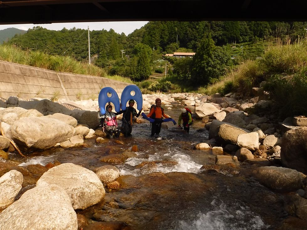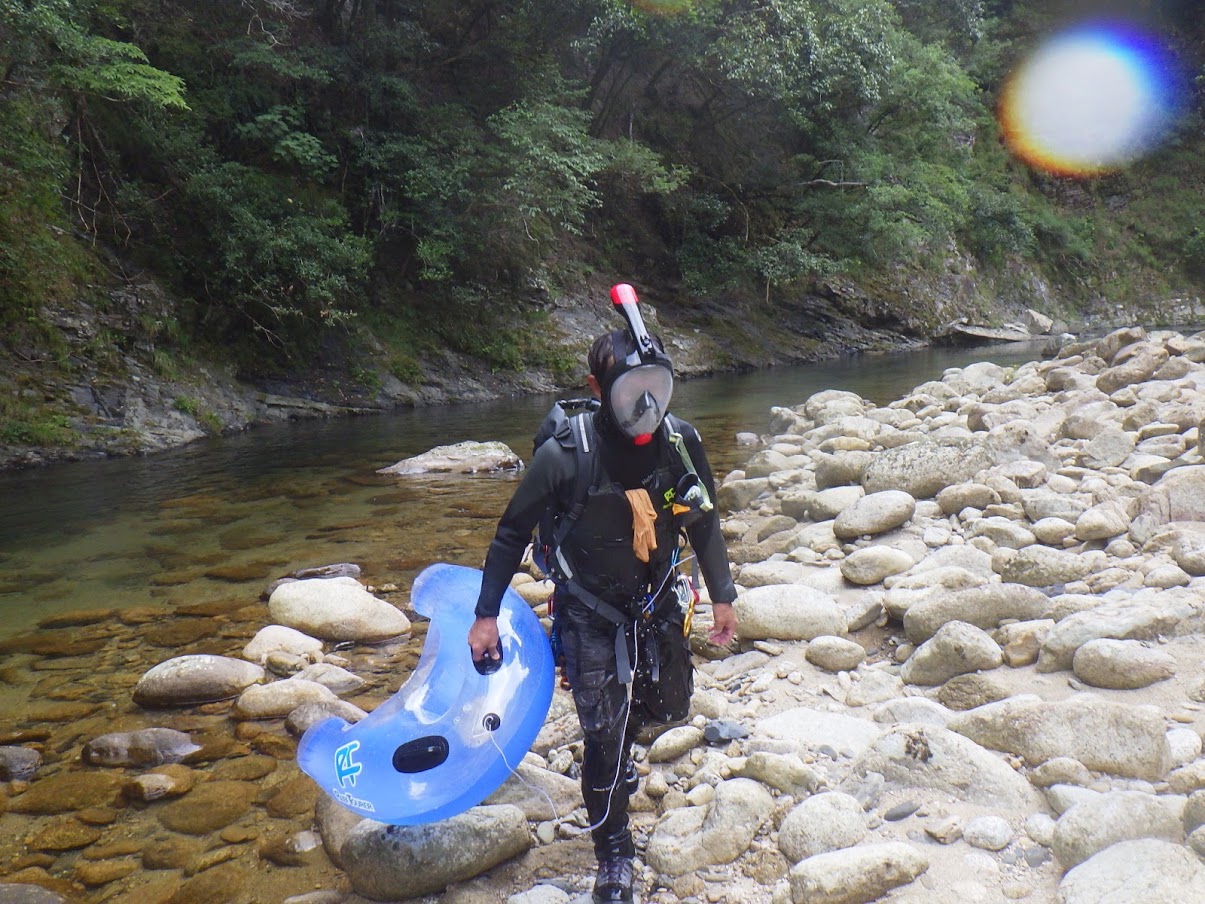 入渓は里川のようなところから。どこにでもあるような日本の原風景のような感じ。いつもと違い川を歩き下る。piccolo&ケルト組はスライダー用の浮き輪を新規購入したとのこと。海水浴に来た子供よろしく、浮き輪を引っ張りながら歩いていく。 ゴロタ石をただ歩くのもつらい。膝くらいの深さになったら、だれともなく浸かって流れ出す。