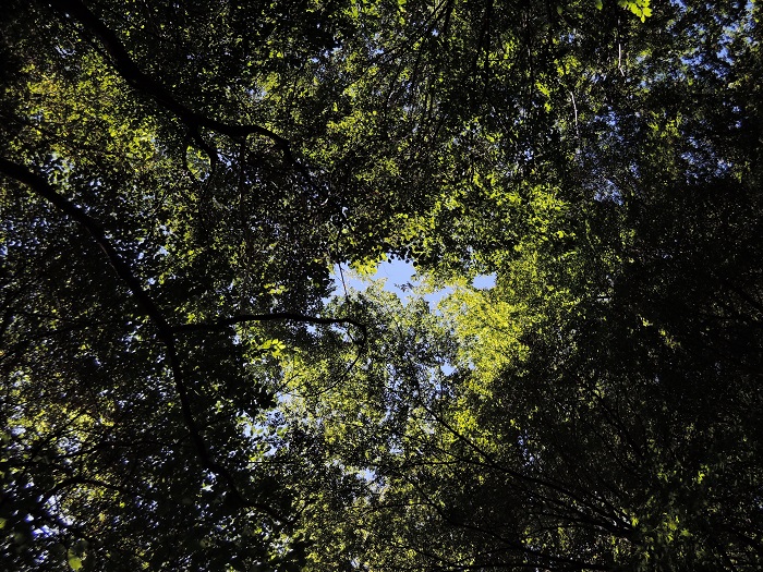 わたしはザックを背負っているときは背中浮き袋の背泳で。ザックを枕に見上げると木々の上には青空が。すべてを忘れさせる。 ザックを外して浮き袋にするときはゴーグル着けて水中見学、アユの群れが出迎える。 顔を上げると周りの風景はちょっとしたジャングルだ・・・ここはどこなんだろう・・・。