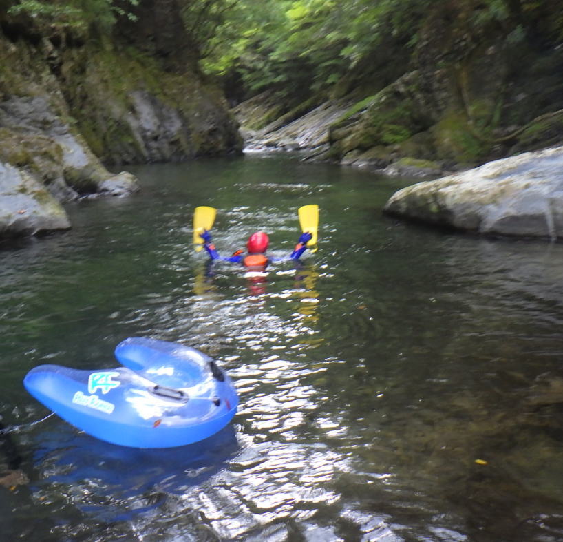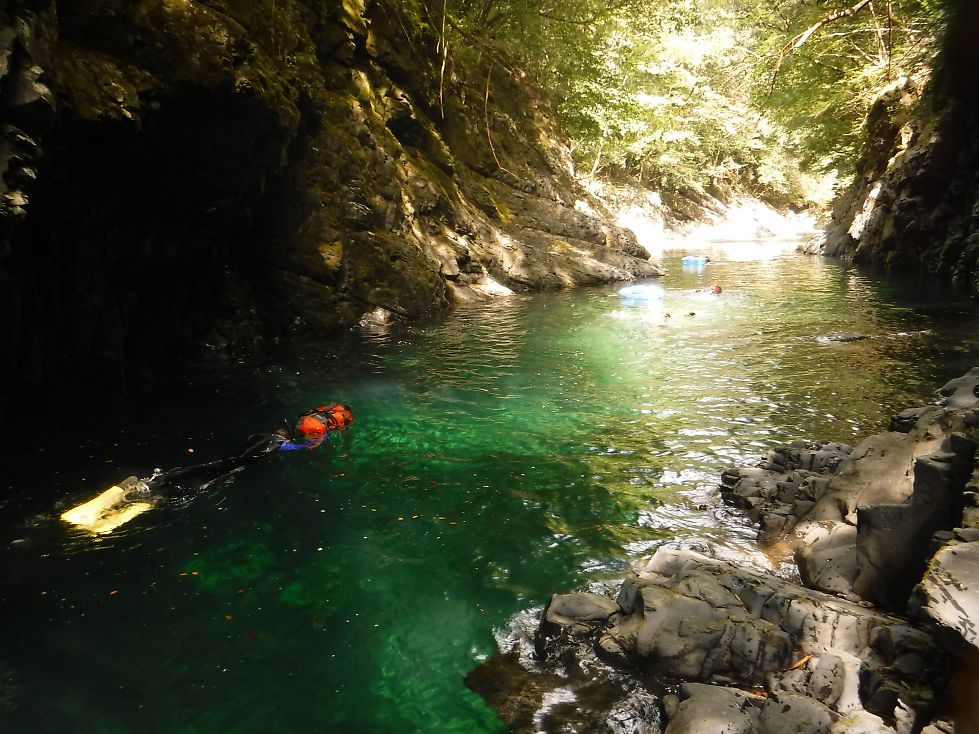 piccolo&ケルト組はモハヤ沢をリゾート地に変えている。浮き輪にゴーグル&ウェット、完全武装だ。 シューさんは外見は正統派沢屋の格好。いわゆる背泳スタイルで先頭を切って流れていく。グーさんは初めてのライジャケお気に入りみたい。平泳ぎだけどこれがまた早い。