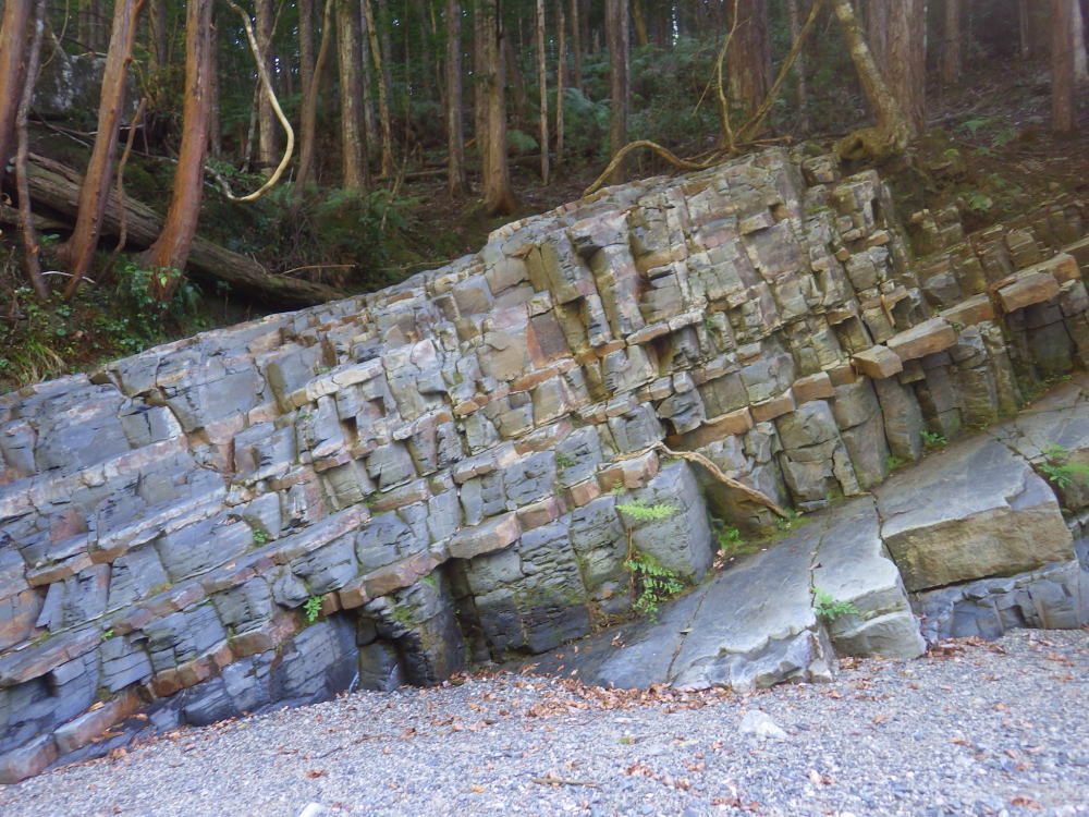 またイニシエの跡が?途中にも水を取る石積み堰堤の跡があったのでまた、と思っていたら、これが自然の地層でできた取水堤!?そっくりの構造物。それぞれがハッと気づいてそれぞれが驚いている。