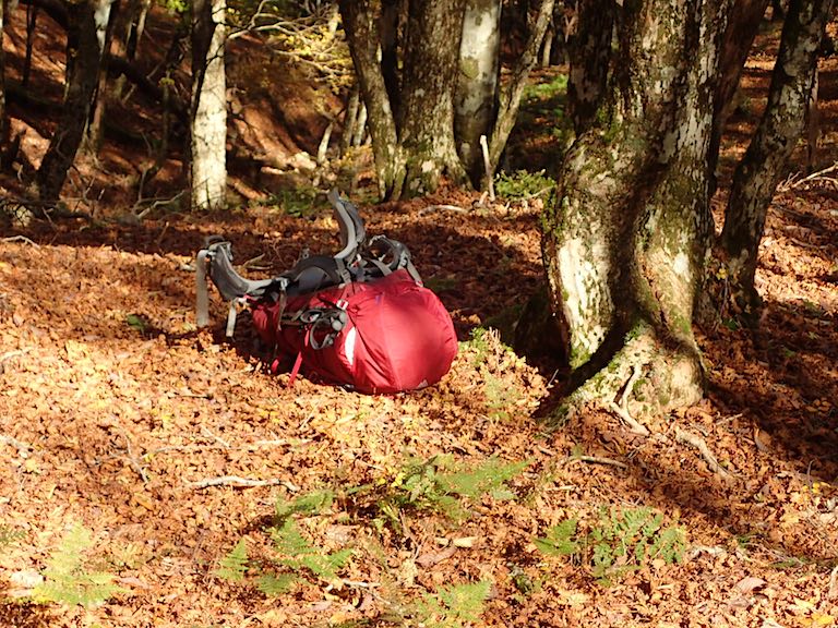 檜塚劇場からの帰り、山腹を登りかけると、谷寄りにポツンと置いてあるザックが。