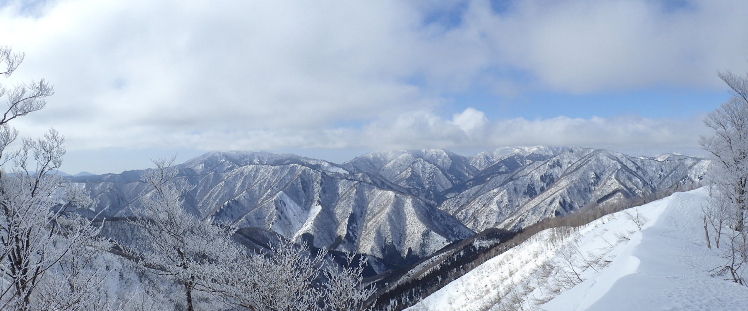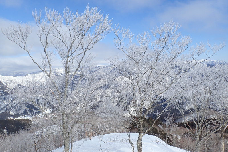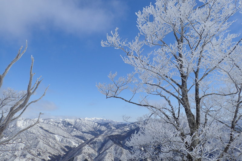 >眼下に見える九頭竜湖と、屏風のように続く九頭竜川対岸の山並み。そしてうれしいことに霧氷が木々を飾り始めた。