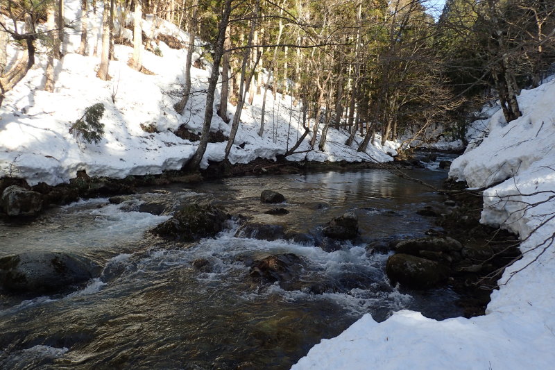 仕方がない。覚悟を決めて一番流れの緩そうなところでスノーシューを履いたまま渡渉した。