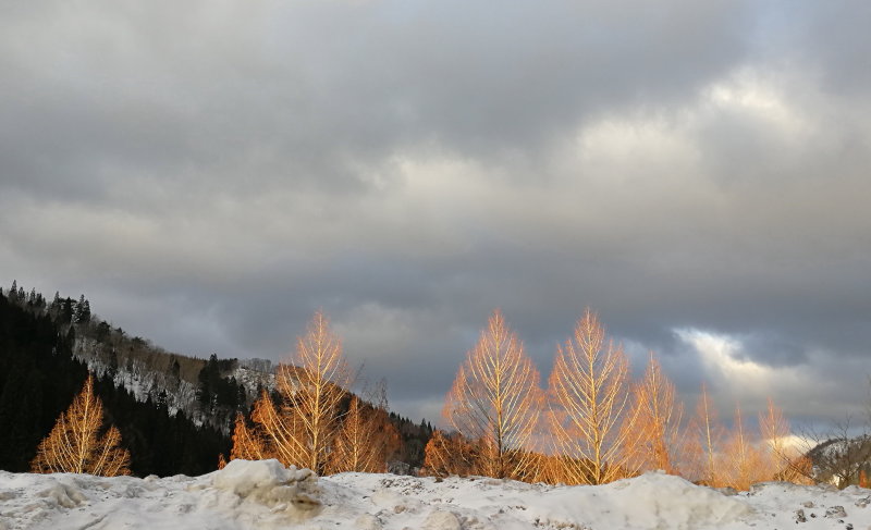 うに続く九頭竜川対岸の山並み。そしてうれしいことに霧氷が木々を飾り始めた。今日は霧氷が付く条