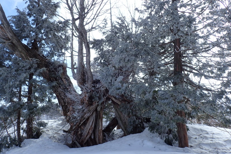 >そしてうれしいことに霧氷が木々を飾り始めた。今日は霧氷が付く条