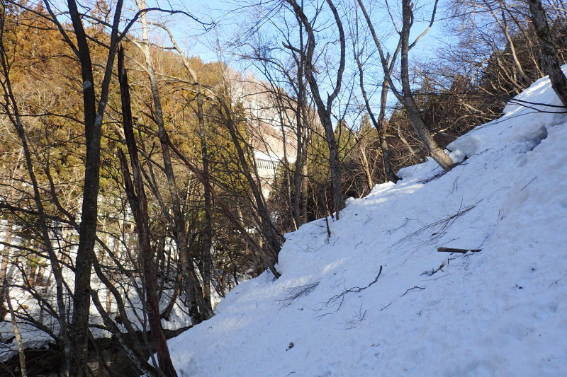 橋を渡ればすぐに国道・・・のはずだった。少し左に振り過ぎたので際どいトラバースで右に回り込ん