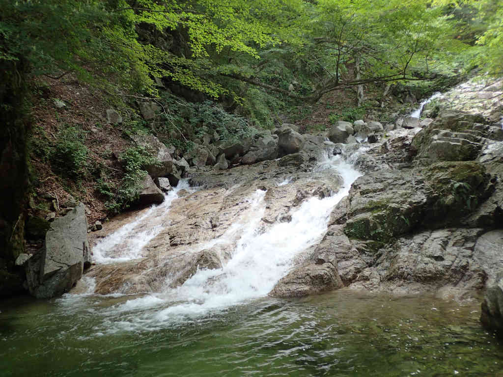 Keikokuさんは沢初心者だということで,私が先行してときどき後ろを振り向くと,常に私のすぐ後ろにいる.「ペースが遅いのかな」と思って少しペースを上げるとそれでもすぐ後ろにいる.結局,この沢行を通じて結構早いペースで歩いてしまいました.