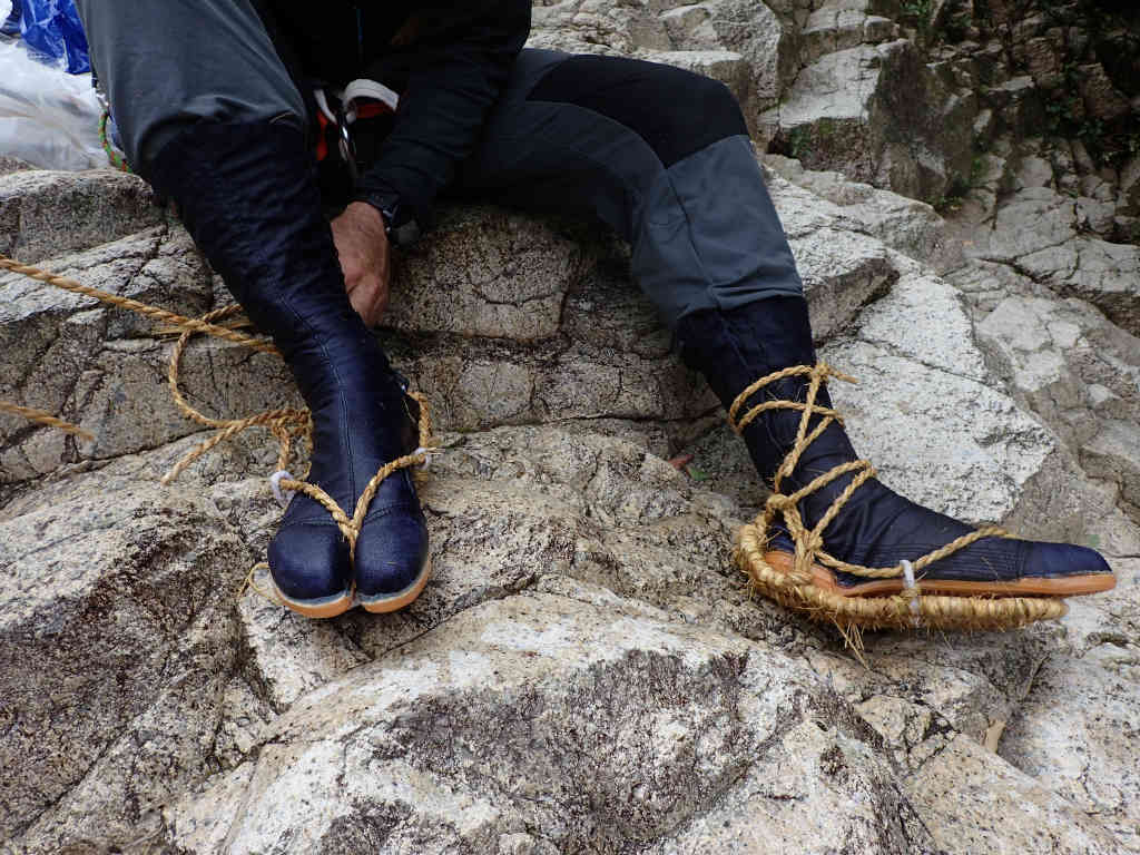 ワラジは、今はまとめて買っても1足、1,000円近くするようです。私は、20年前の厄年の時に村の祭りで余ったワラジを大量に貰ったので、取り敢えず沢靴を買わずに使っていましたが、ついにその大量のワラジも底をつきかけていますので、沢靴にしようと思っています。今回も、沢靴とのフリクションの違いに戸惑いました。つるつるの花崗岩をシュークリさんが難なく上がって行くのに、滑ってちっとも上がれず困りました。ラバー底にするか、フェルトにするか検討中ですが、ついに乗り換えです。