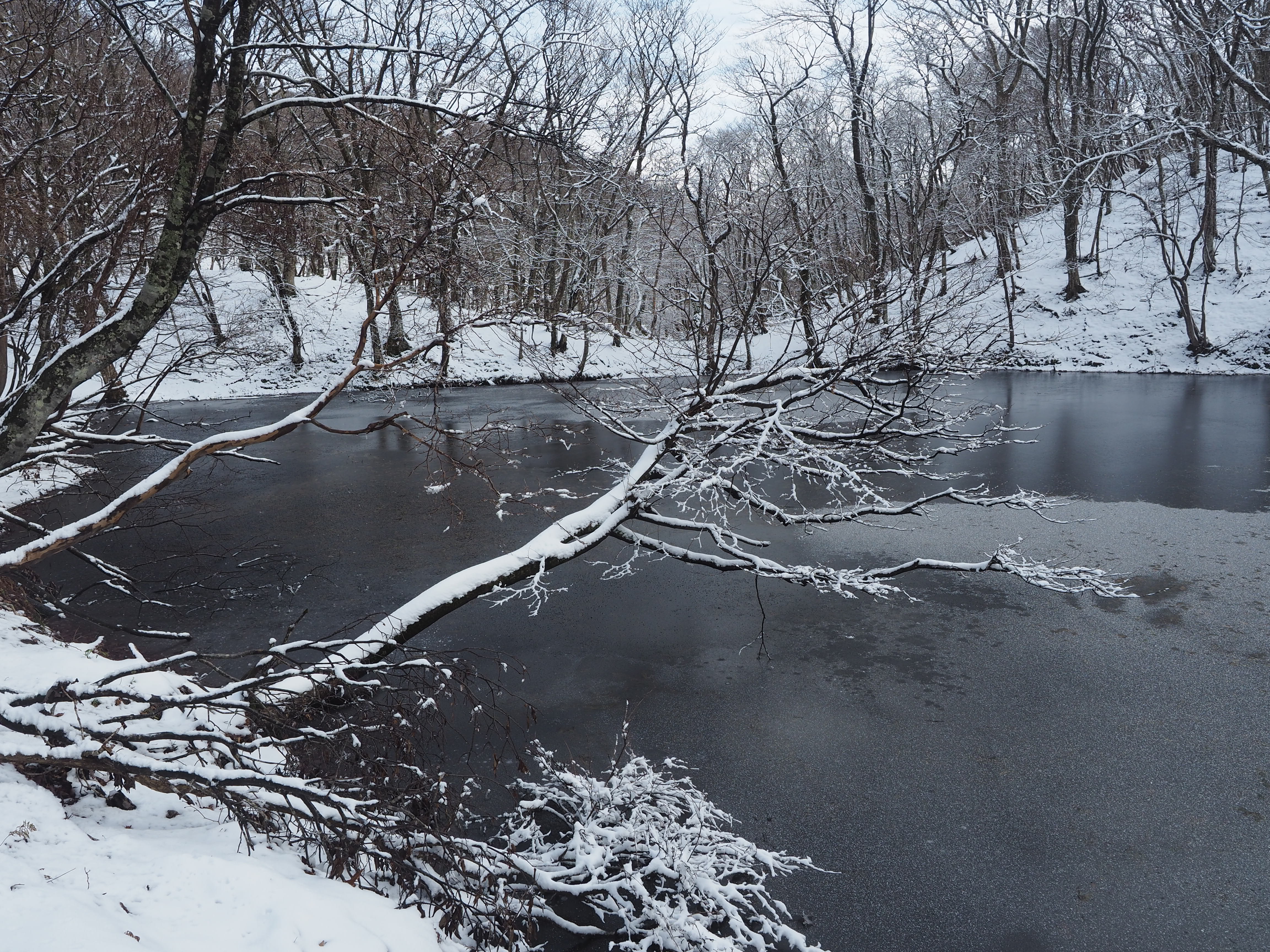どの池も氷とその上にわずかに降り掛かけられた粉雪で薄化粧をされているのは同じである。漆黒の氷面の上に振りかけられた細かい雪は星空を思い起こさせる。実際、すりガラス状の氷が水面の下に堆積した黒褐色の落葉を覆い隠し、雪の下に消えゆくまでの限られた期間、池に独特の装いを施しているのだ。